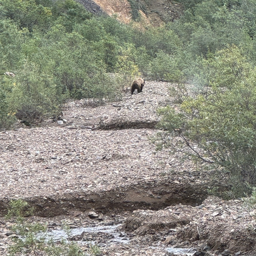 My favorite animal sighting was the grizzly bears. Our tour saw a total of 7 I think! I missed two of them because the angle was weird, but I saw them on the screen that the guide was projecting onto with his camera. I did, however, get a great view of the first one, especially when it walked out of the bushes for a couple seconds (my dad caught the moment perfectly in the picture below!), and I’m pretty sure there was another one with it but it was very hard to see. It was so exciting to have actually spotted one! Then later we saw a mom and two cubs, and they ran down a hill! I was really hoping that we’d get to see some bears and we were not disappointed! Even the tour guide said it was quite the day for bears. I’ve never seen one in the wild (and I’m glad it was from a safe distance and place), and I don’t think I’ve ever seen a big predator like that in the wild. It was just so neat to see real bears, in the wild, and to see so many!